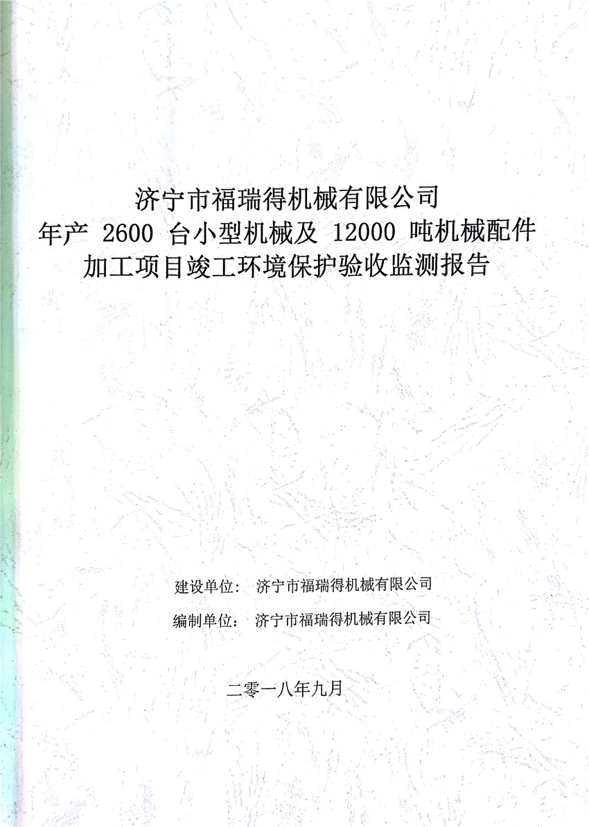濟(jì)寧市福瑞得機(jī)械有限公司年產(chǎn)2600臺(tái)小型機(jī)械及12000噸機(jī)械配件加工項(xiàng)目(廢氣、廢水)竣