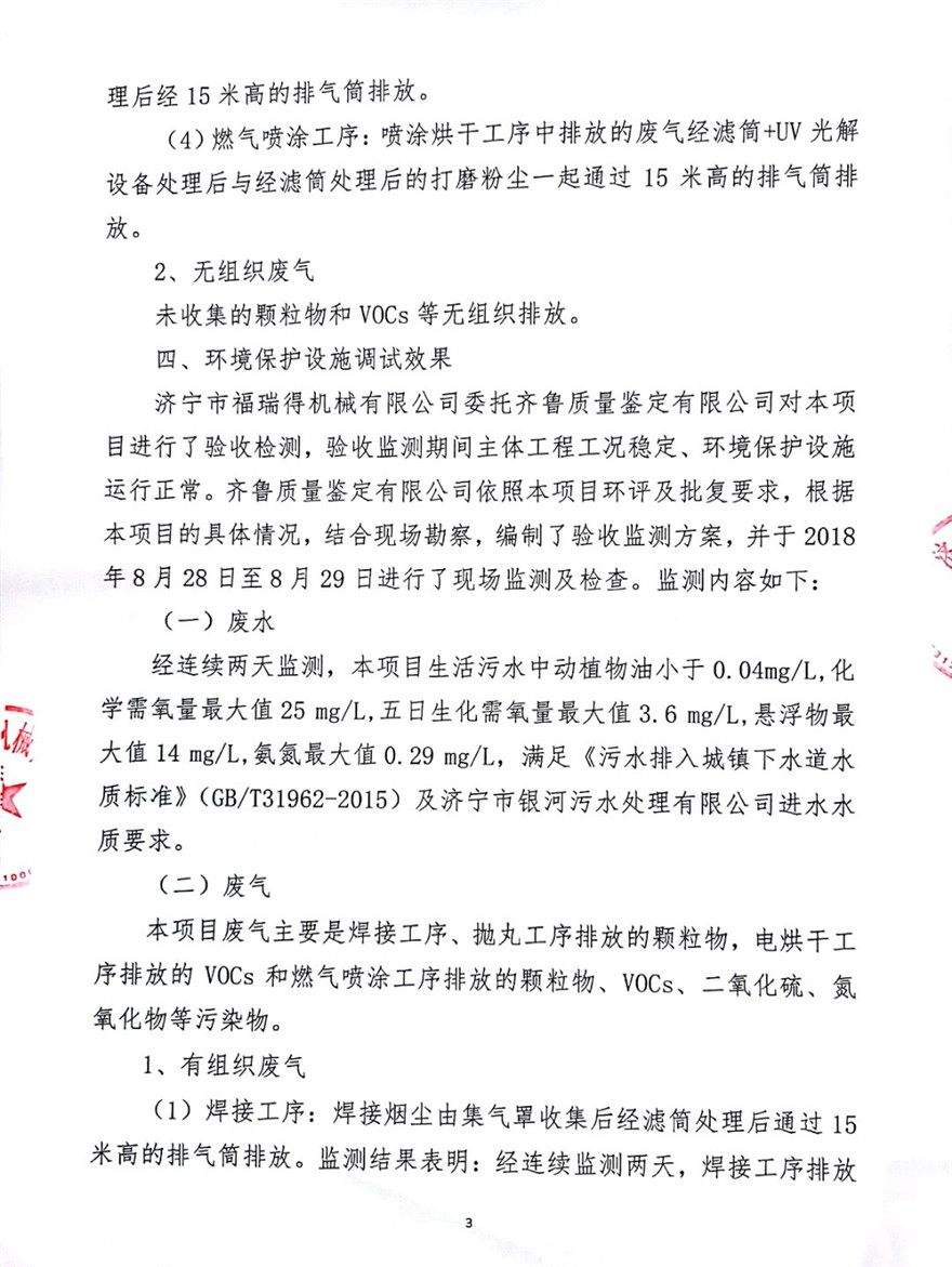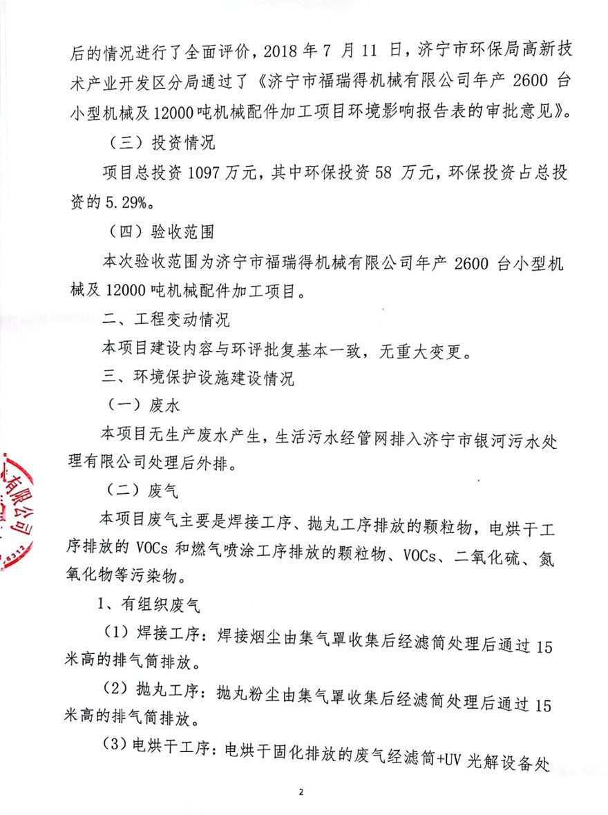 濟(jì)寧市福瑞得機(jī)械有限公司年產(chǎn)2600臺(tái)小型機(jī)械及12000噸機(jī)械配件加工項(xiàng)目(廢氣、廢水)竣