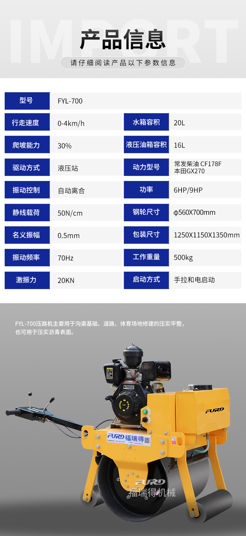 主要用于溝渠基礎(chǔ),道路,體育場地的壓實整平, 也可用于壓實瀝青表面的作業(yè)。