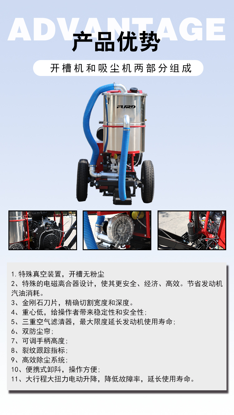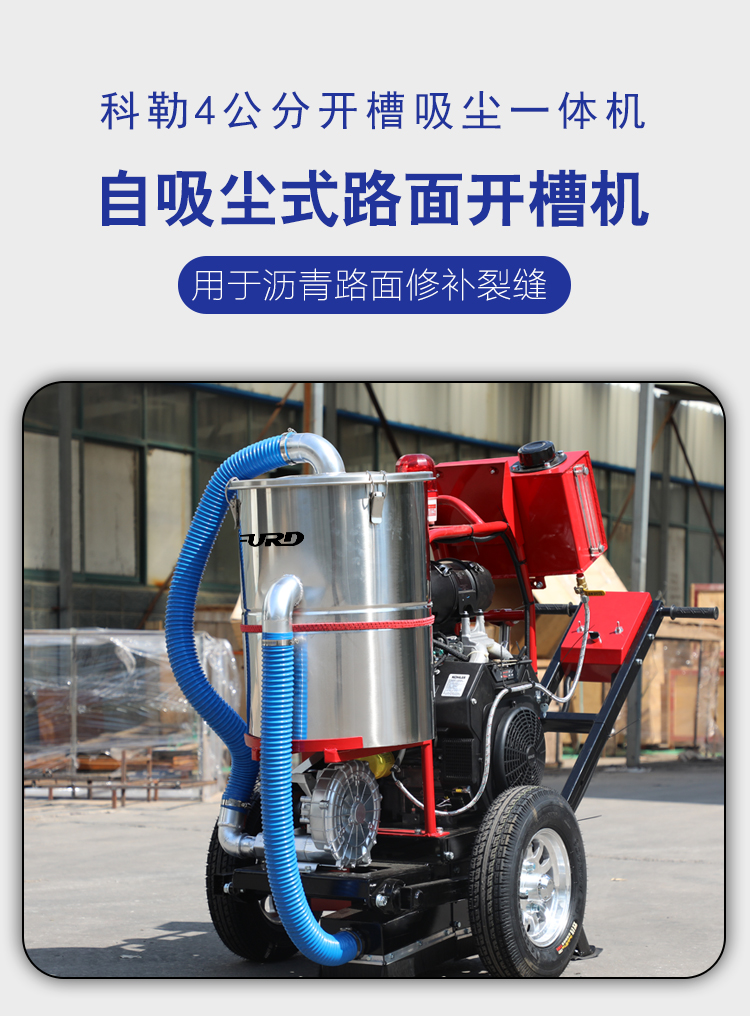 自吸塵式路面開(kāi)槽機(jī)主要用于瀝青路面修補(bǔ)裂縫開(kāi)槽的機(jī)械,其集吸塵、開(kāi)槽為一體,環(huán)保性好,工作效果高,是路面開(kāi)槽施工不錯(cuò)的選擇。
